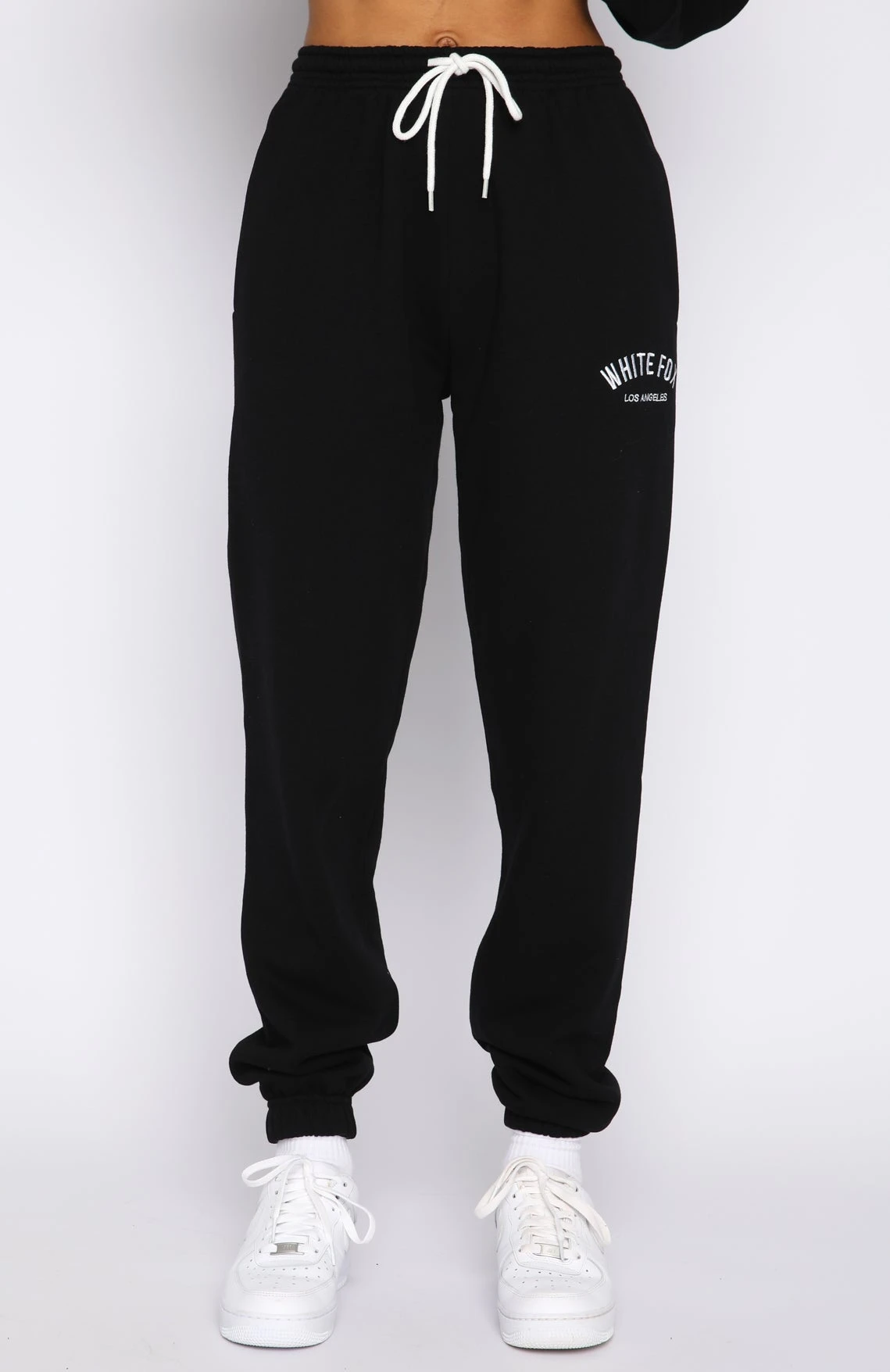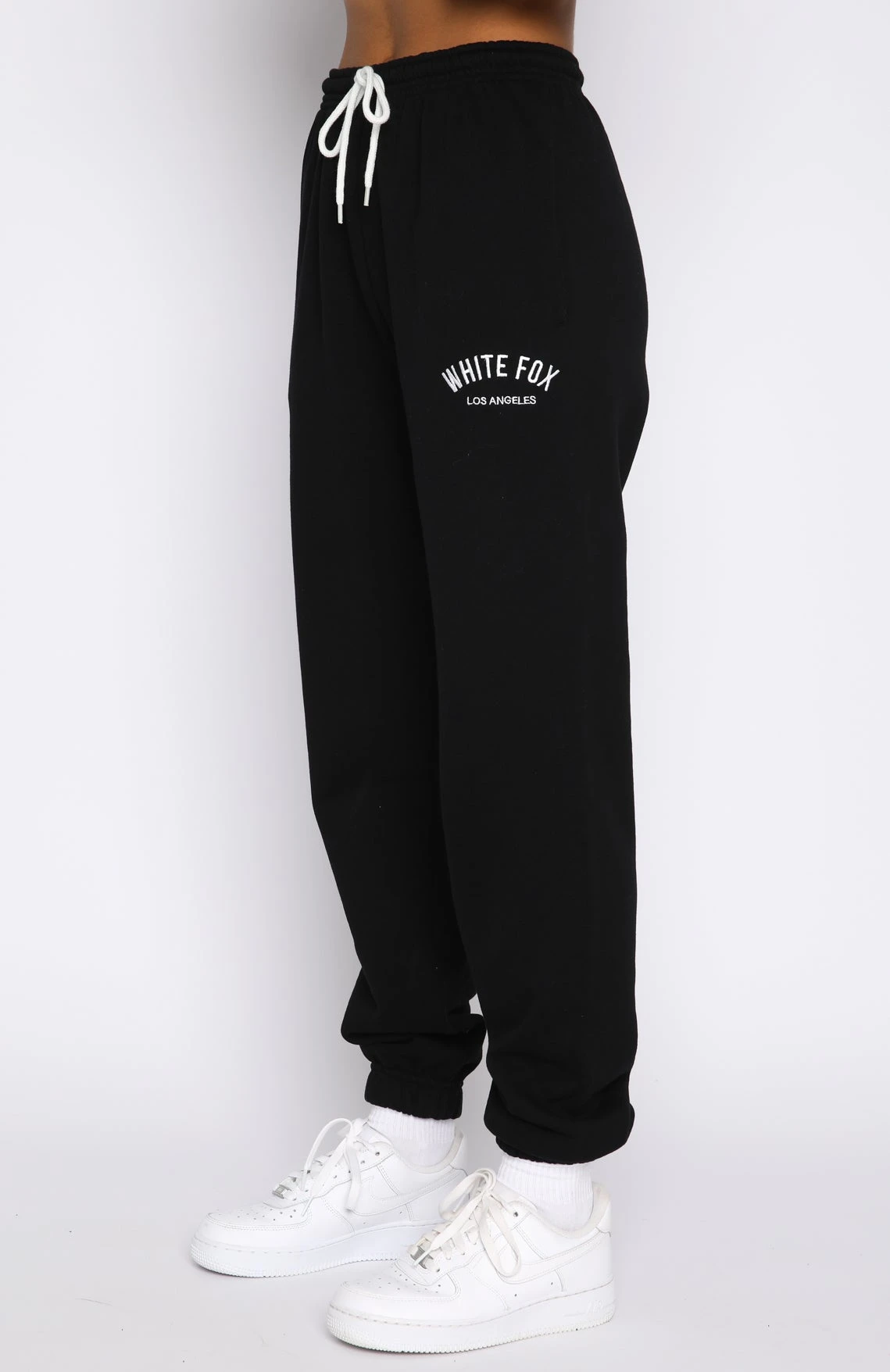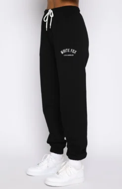 Your new favourite cool girl loungewear the About That Time Sweatpants in Black. Featuring a high elasticated drawstring waistband, elasticated ankle cuffs, side pockets, embroidered logo side front and side leg and and soft feel loopback fabric. Pair with the matching The Highest Demand Zip Front Sweater.