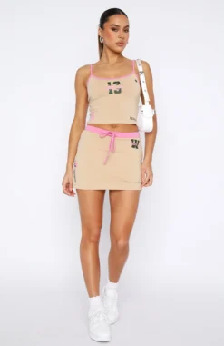 Your sporty and rich vibe just got so cute! The All Star Season Mini Skort Sand features a mid-waisted fit, attached shorts underneath, small waistband with drawstring detail, stretch fabric and printed logo side front. Pair with the All Star Season Tank Top Navy for a super cute look!