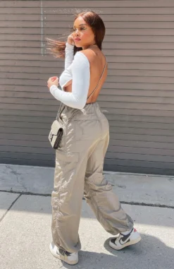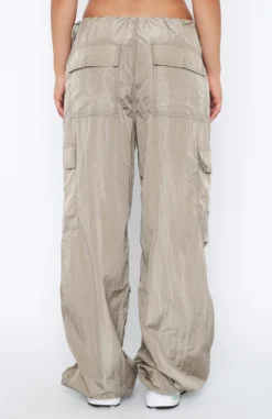 Parachute pants are our current obsession and we are living in the Be The Moment Cargo Pants in Stone. Featuring a parachute pant design and a wide leg fit, button closure, side and cuff drawstring with toggle, back and side pocket design and lightweight fabric. Pair these parachute pants with a long sleeve top and sneakers for a super chic look.Â