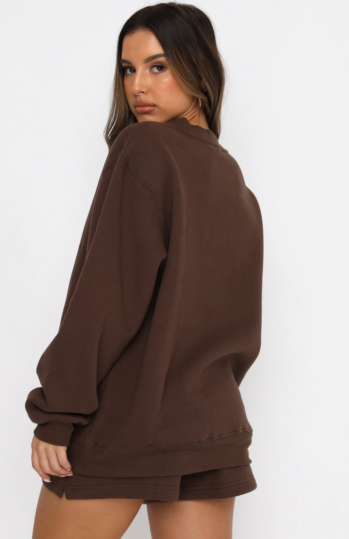 Give off vintage 90’s vibes in our Best Of Both Oversized Sweater in Chocolate. This jumper is a vintage look with a high scooped neckline, ribbed neckline, hemline and cuffs, embroidered logo front centre and is fleece lined to keep you feeling cosy. Complete the matching tracksuit set with our Along For The Ride Lounge Shorts or Make You Mine Sweatpants and sneakers for a chilled chic look.