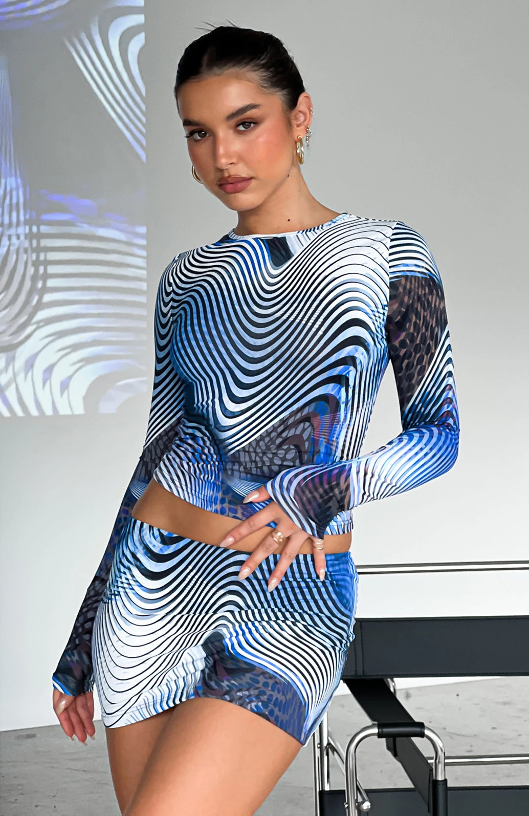 Inject some bold prints into your wardrobe with the Bring Me Along Mini Skirt in Blue Illusion. This mini skirt is low-waisted and features stretch fabric. Complete the look with the matching Working On Me Long Sleeve Crop and strappy heels for a stand out look.