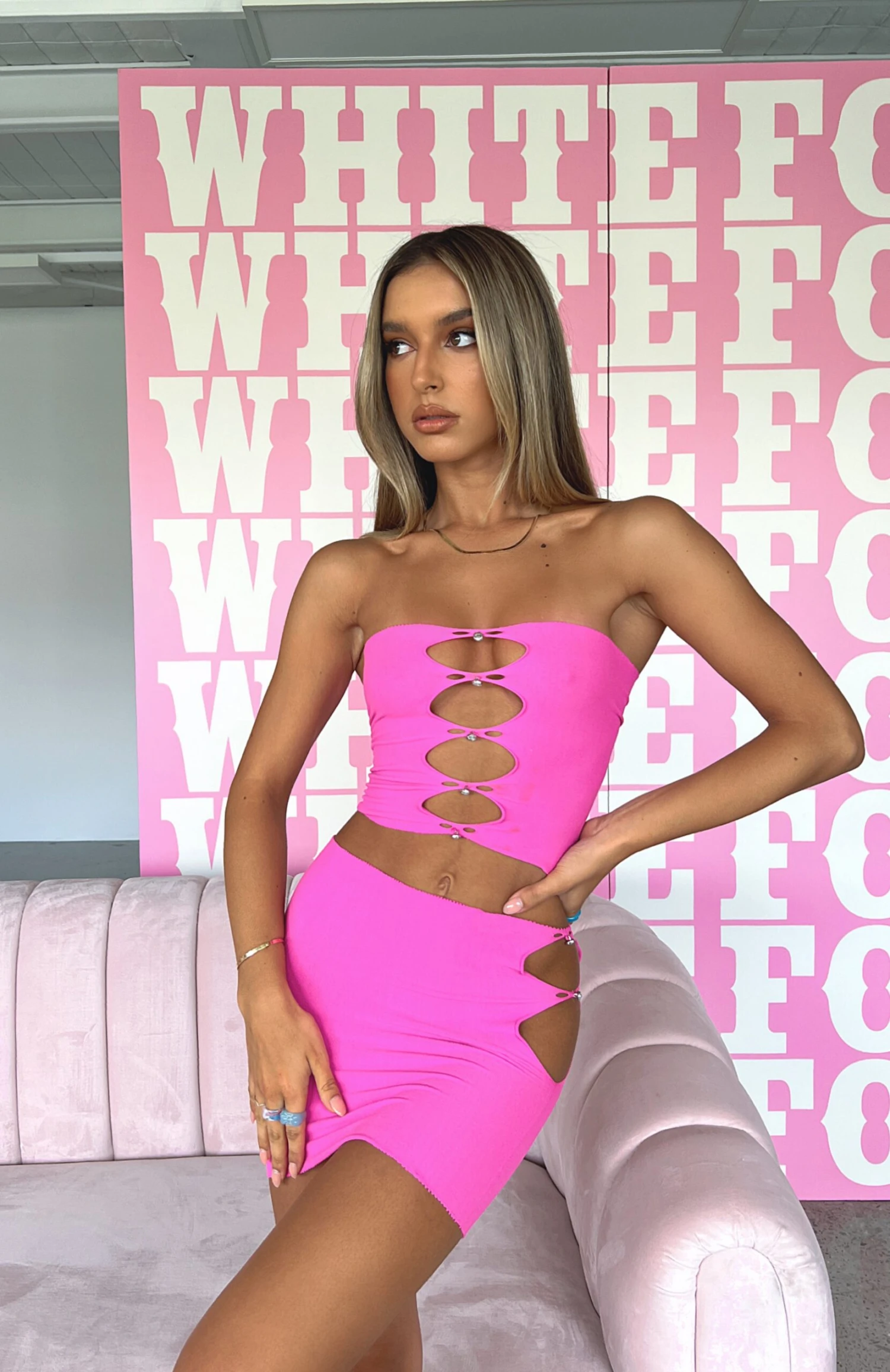 Prepare to steal the spotlight in the Built Like This Mini Skirt in Hot Pink. This stocking mini skirt is high waisted, mini length, raw hem and cut-out details on sides with diamanté detail. Pair with the matching Triggered Crop and clear heels for an unforgettable look. This is a delicate sheer fabric with stretch so one size fits most.