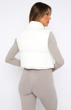 Bundle up in the Chalet Girl Puffer Vest Off White. Features functional zip closure, quilted body and stand collar. Complete the look with your favourite pair of White Fox Denim Jeans, long sleeve top and sneakers for the perfect winter outfit.
