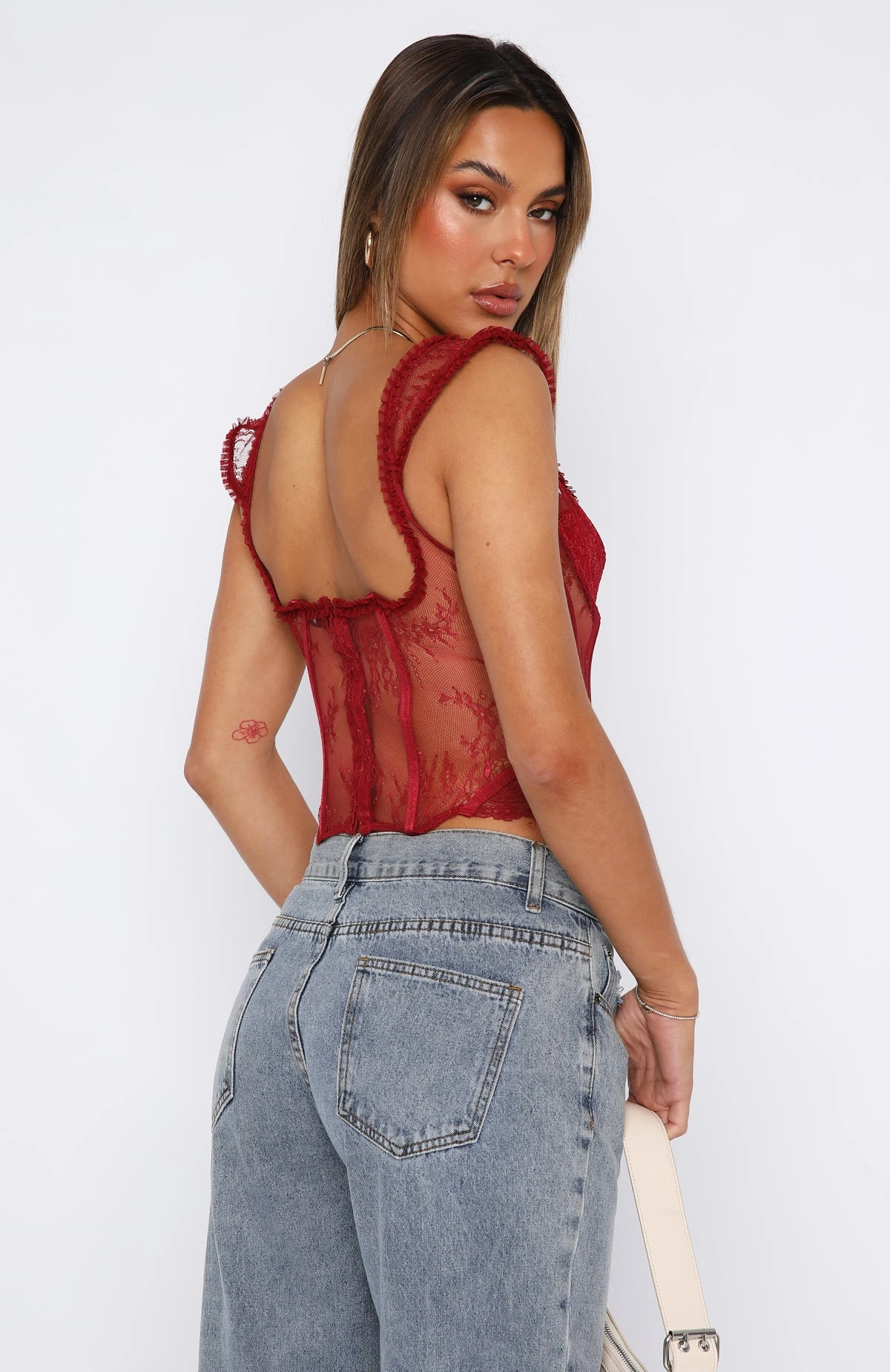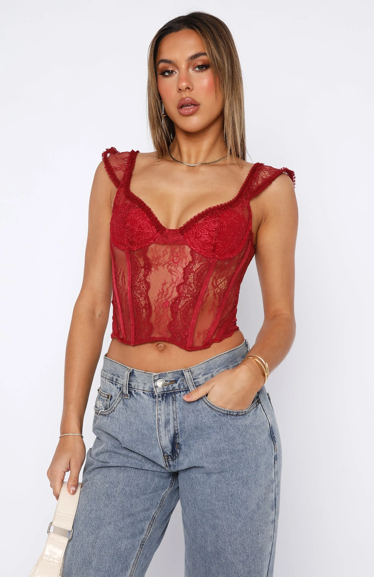 Make them stop and stare with the Coastline Dreaming Lace Bustier in Wine. Featuring thick straps, plunge neckline, bust underwire, boning in bodice, eyelet closure centre back, lined at bust to avoid sheerness and lace fabric. We love this paired with a cute pair of White Fox Denim Jeans and platform slides for the perfect girls night out fit!