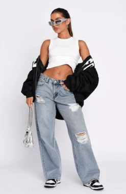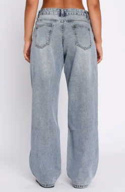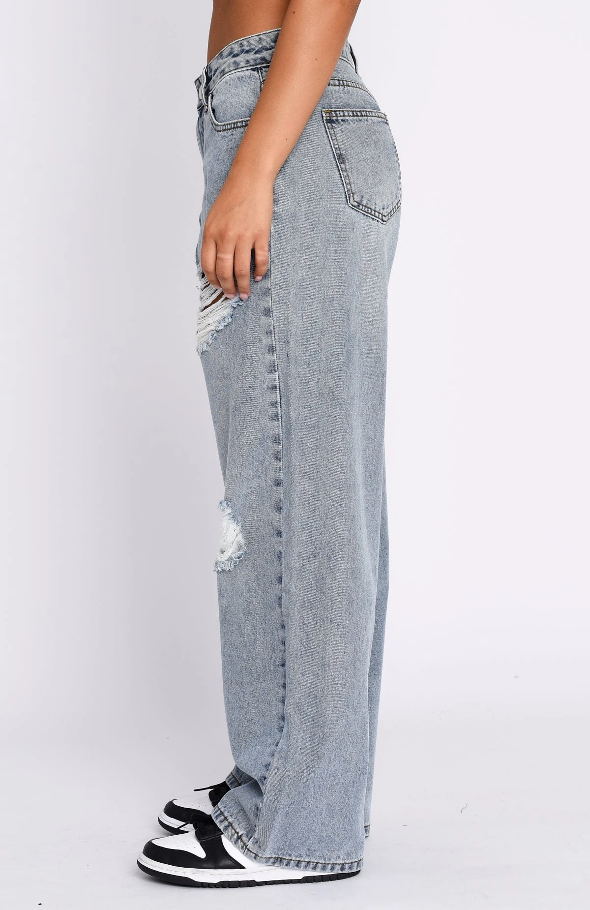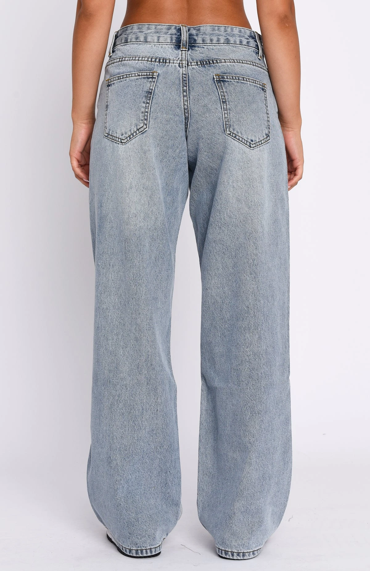 Channel everyday street style in the Cross My Path Jeans in Blue Wash. These mid-rise, relaxed fit jeans feature straight leg style, silver button and zip closure, distressed rip detailing, belt loops and 5 pocket design.