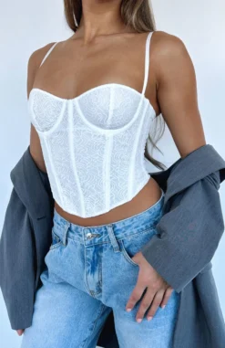Add some structure to your look with the Dancing To Forget Bustier in White. Featuring thin, adjustable straps, bust underwire, boning in bodice, zipper centre back and lined, lace fabric. We love this paired with your favourite pair of White Fox Denim jeans and platform slides for a look that is sure to turn heads!
