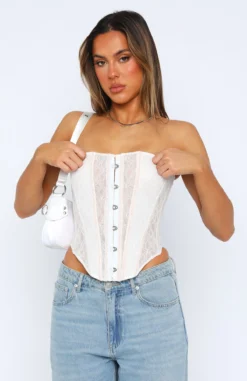 Add some structure to your look with the Dancing To Forget Bustier in White. Featuring thin, adjustable straps, bust underwire, boning in bodice, zipper centre back and lined, lace fabric. We love this paired with your favourite pair of White Fox Denim jeans and platform slides for a look that is sure to turn heads!