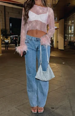 You’ll be looking like an angel in the Day And Night Long Sleeve Crop in Baby Pink. Featuring long sleeves with feather detail, high neckline and sheer diamante fabric. We love this paired with your favourite pair of White Fox Denim Jeans or a mini skirt and a glam bag and get ready to steal the spotlight!