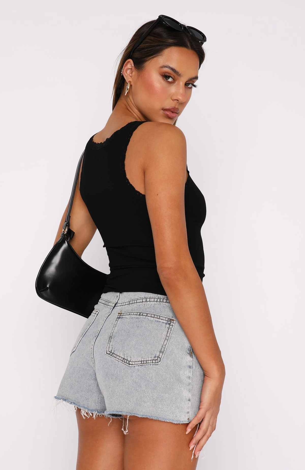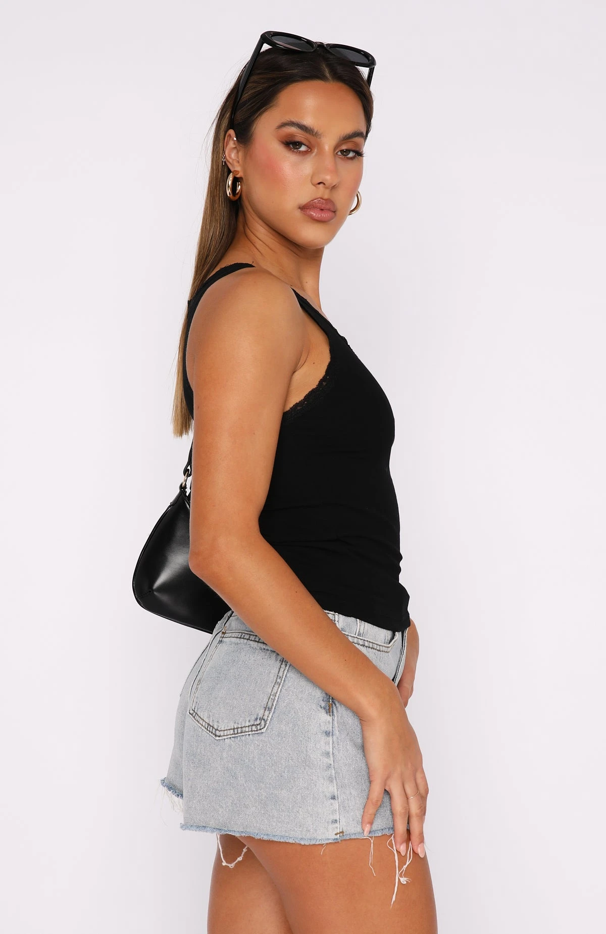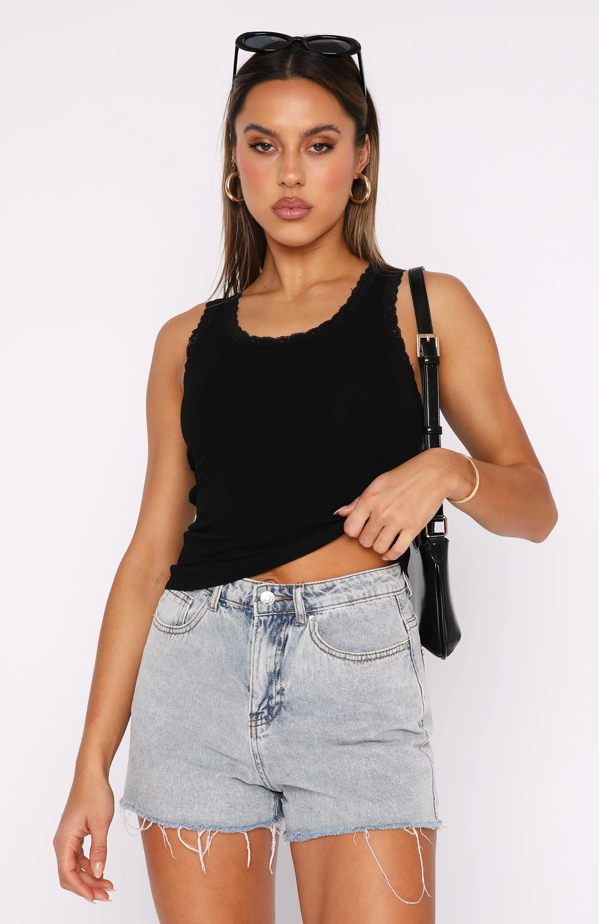 Get the dreamy look we all love with the Deliver The Heat Top Black. Featuring a low neckline, soft stretch fabric and gorgeous lace hem detailing. We love this paired with a low rise White Fox Jean and clear mules for a look worthy of your weekend plans! Perfect for layering.Â
