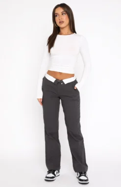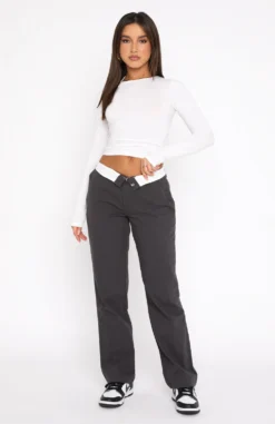 The Don’t Mess Around Pants in Charcoal are an essential in your everyday wardrobe. These pants are a straight leg fit with zip and clasp closure, pockets and 7 belt loops. You can wear with the waist turned over to show the white lining or closed. Complete the look with a cute crop and sneakers for the ultimate cool girl look.