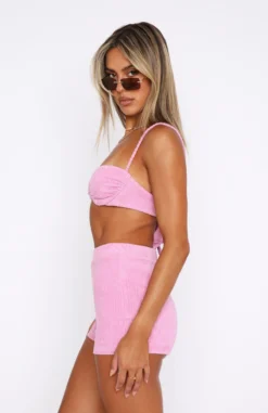 The Dream Escape Booty Shorts in Pink is giving us ALL the vibes! These booty shorts are high waisted with a thick elasticated waistband and terry fabric. Complete the look with the matching Holiday Nights Crop and slides for the perfect weekend fit!