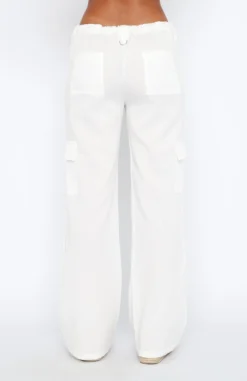 The Headsprung Pants in White are essential for a cool girl fit! These pants are low-rise and feature a cargo pants design, flared legs, drawstring with toggle and side pocket design on legs. Pair with a bustier and heels for a look we love!