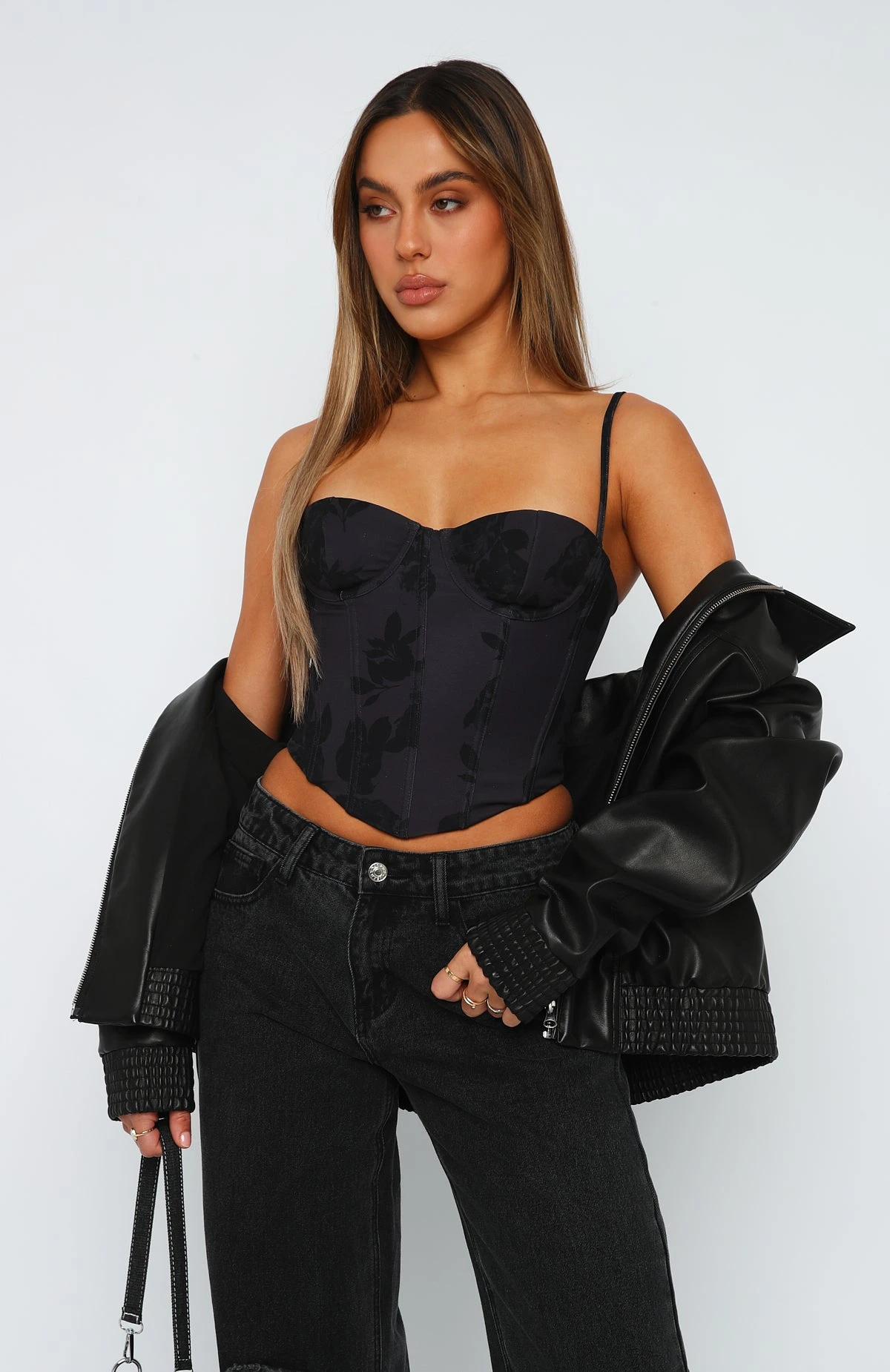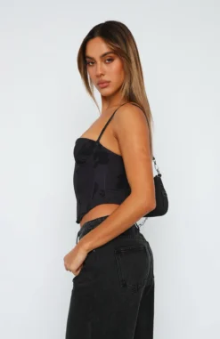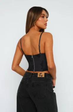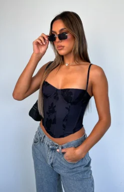The In The Morning Bustier in Noir Floral is a weekend staple. Featuring thin, adjustable straps, bust underwire, boning in bodice, zipper centre back and lined fabric. Pair with a cute mini skirt and perspex heels for a dreamy look!