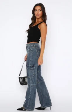 Tap into the grunge-girl aesthetic with the Incomplete Mid Rise Straight Leg Jeans Jive Blue. Features a cargo design jean, straight leg fit, belt loops & button/zipper closure front and side leg pockets with zip closure, back pockets and mid rise fit. Pair with a cute crop and gold accessories for an on trend and casual vibe!
