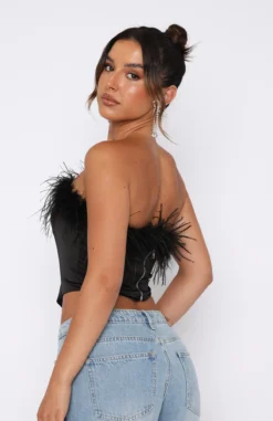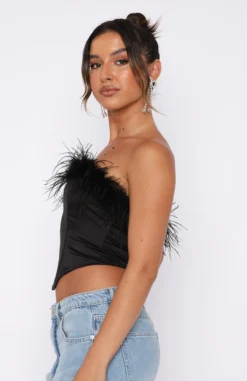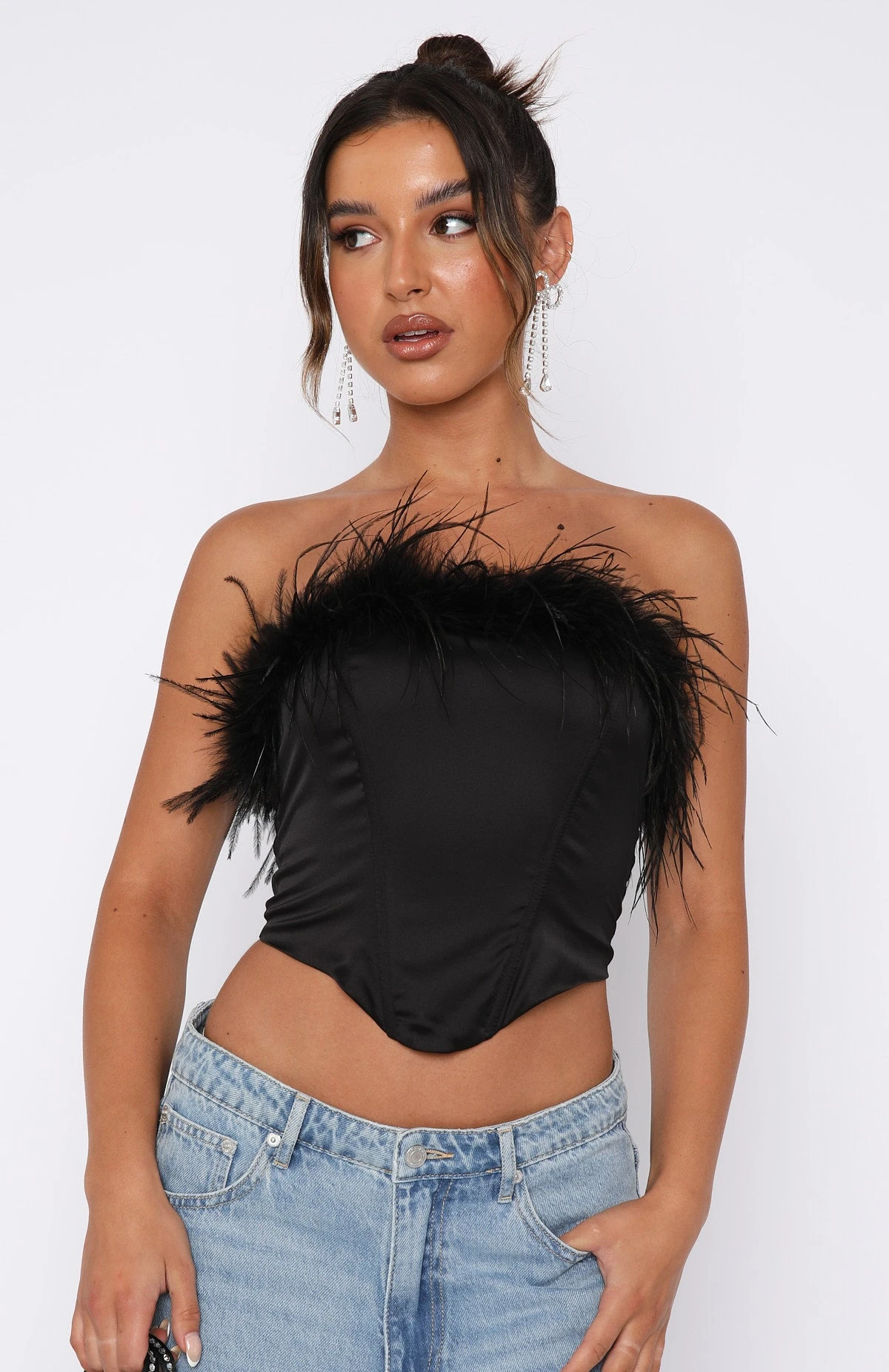 Exude a hot look at your next party in the Levelled Up Bustier in Black. This strapless bustier features boning in bodice, zipper centre back, feather detail across bust and lined, silk-feel fabric. Pair with your favourite pair of White Fox Denim Jeans and heels for a show-stopping look!