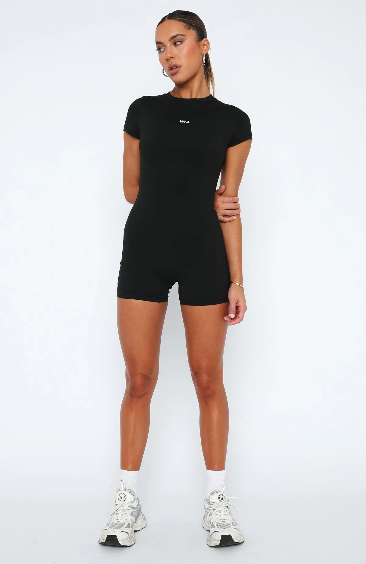 The Live For The Weekend Playsuit in Black will take you from pilates to coffee. Featuring short sleeves, invisible zipper centre back, mini short length and printed logo centre front. We love this paired with sneakers and your favourite gym workout!