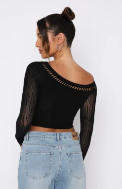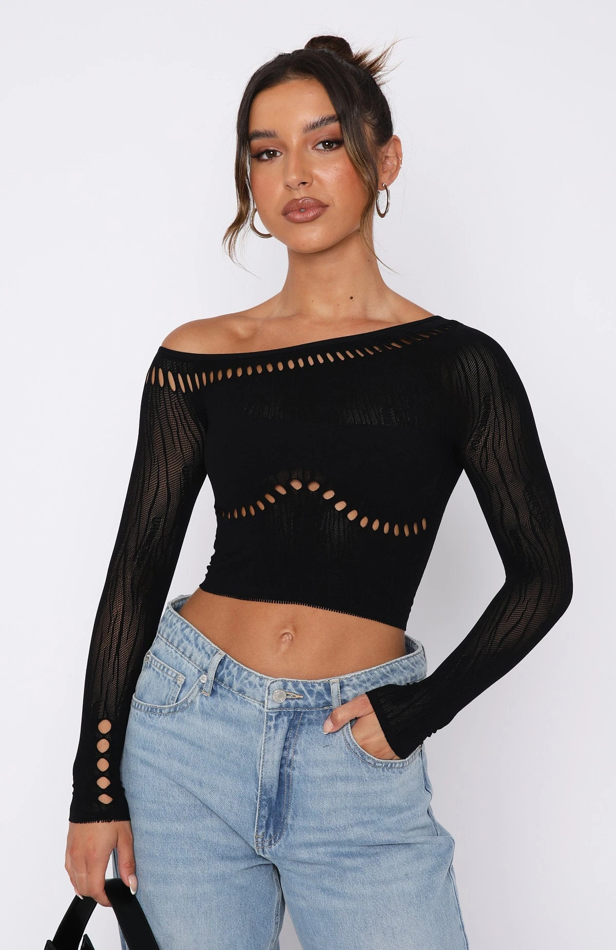 We are obsessed with The Losing Sleep Long Sleeve Top in Black. Featuring long sleeves, an off-the-shoulder design, cut out details and stretchy stocking fabric so one size fits most. Pair with cargo pants and gold accessories for a dreamy look!