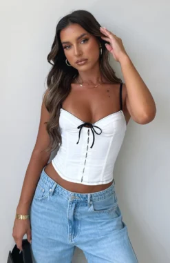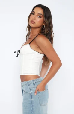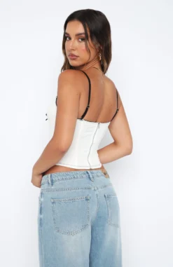 The Man Down Bustier in White is a weekend staple! Featuring thin, adjustable straps, tie-up front detail, boning in bodice, hook and eye front closure, zipper centre back and lined fabric. Pair with your favourite pair of White Fox Denim Jeans and gold accessories.