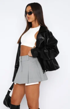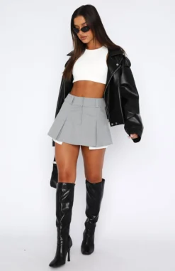 We are obsessing over the Mean It Mini Skirt in Grey! This pleated mini skirt is a mid-rise fit and features belt loops, zipper and clasp closure and mini length. We love this paired with a bustier and knee-high boots for a look we love!
