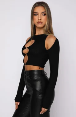 Say hi to our new My Only Vice Crop in Black, a staple basic with a sexy twist! Featuring long sleeves, high neckline, cut out design with ring detail, cut out shoulder design, invisible side zipper and mesh fabric. Pair with faux leather bottoms and heels for an insta-worthy look.