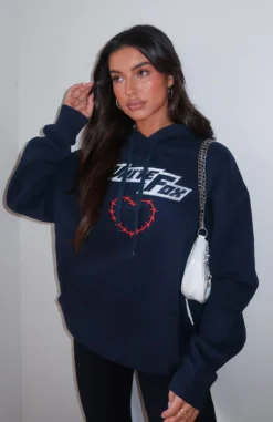 This chill- defying hoodie. The Need To Have It Oversized Hoodie Dark Navy features an elasticated ribbed cuffs & hem, hood, soft fleeced fabric for extra comfort and a embroidered logo centre front. Pair with your favourite pair of White Fox Denim Jeans and gold accessories for a look we love!
