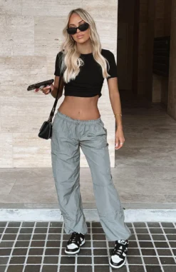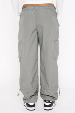 Create unforgettable looks in the Never Blend In Cargo Pants in Charcoal. Featuring a parachute pant design and a wide leg fit, drawstring with toggle, elasticated waistband and cuffs, side pocket design on legs and lightweight fabric. Pair these parachute pants with a long sleeve top and sneakers for a super chic look.Â