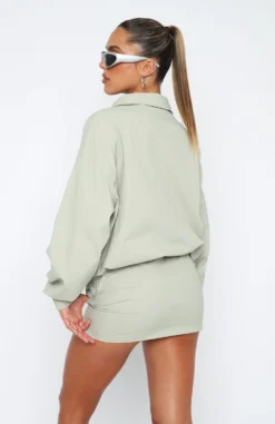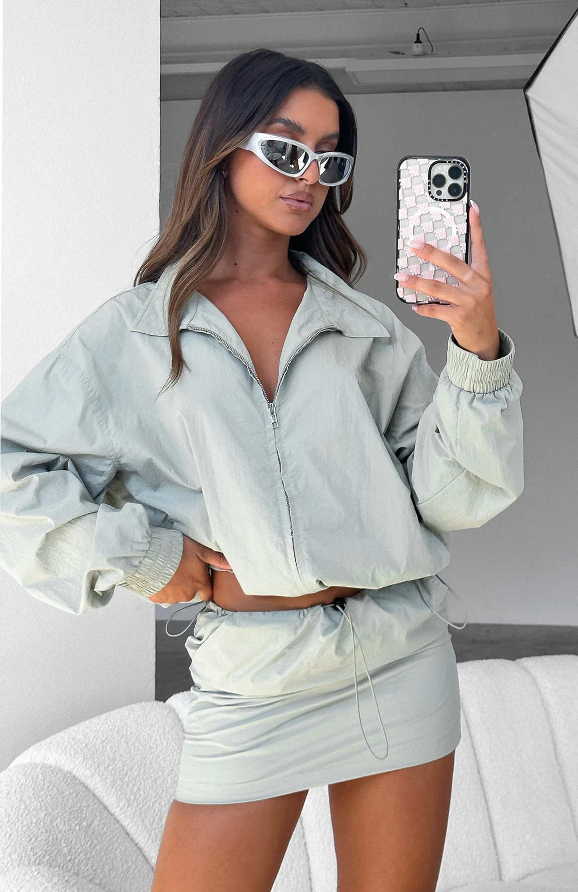 Zip up and go in the Off Duty Jacket in Sage. Featuring collared neckline, zipper centre front, front pockets, elasticated cuffs and drawstring hem with toggle and lightweight fabric. Pair with the matching On My Mind Mini Skirt and sneakers for the ultimate chill day fit!