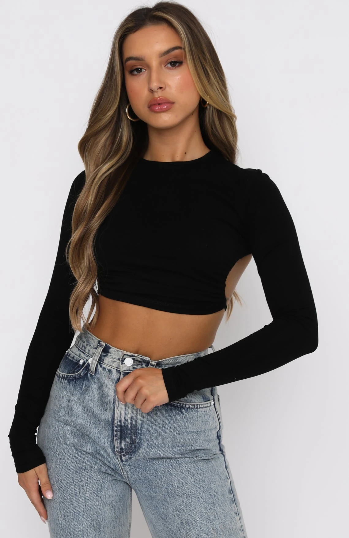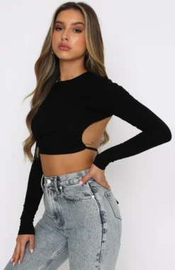 The On My Way Long Sleeve Crop in Black is the perfect way to dress up any bottoms. This top is open back with tie detail, high scooped neckline, and fitted design. Complete the look with denim jeans or shorts for a chic and stylish look.