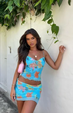 The Perfect Symphony Crop in Sky Blue Floral brings all the glam vibes! Featuring thin straps, tie-up front design, lettuce hem and lined, mesh fabric. Pair with the matching Are You Entertained Mini Skirt and clear mules for a show-stopping look!
