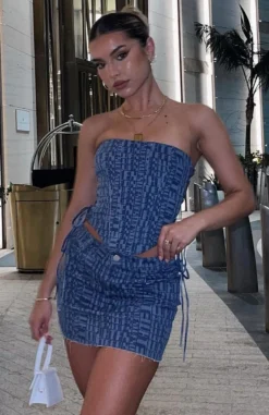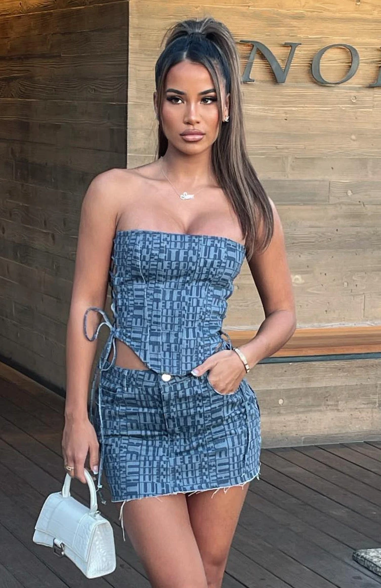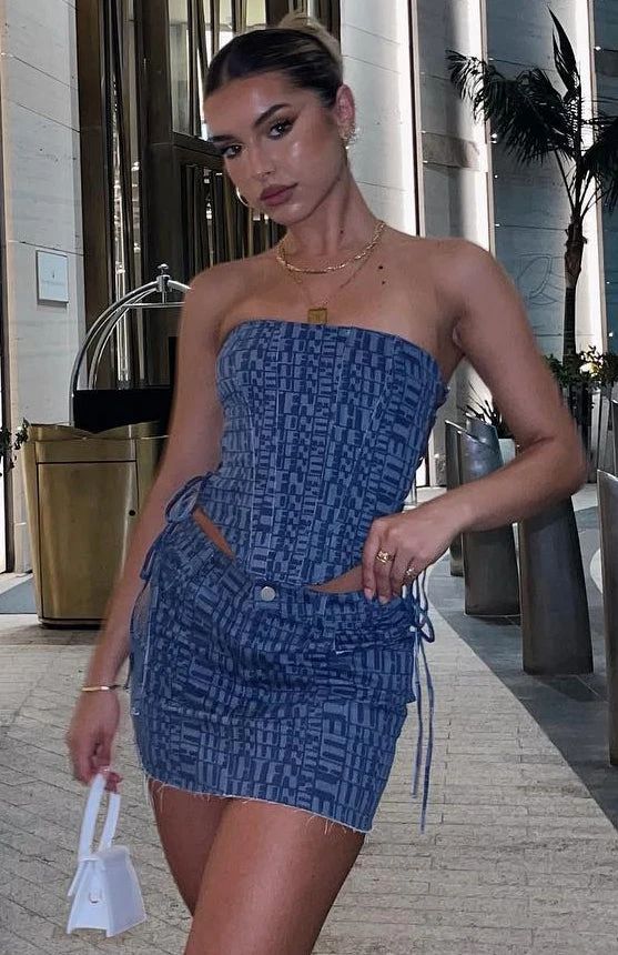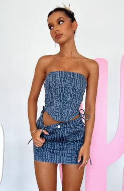 You’ll be looking like a dancing queen in the Power Hour Mini Skirt in Navy Logo Print. This mini skirt is high waisted with button closure and zipper, distressed/frayed hem detailing, belt loops and 5 pocket design. Complete the look with the matching Softest Touch Bustier and Crop and clear heels and you’ll be the centre of attention at your next festival.
