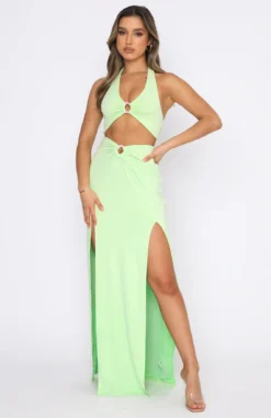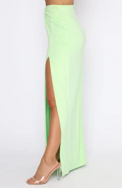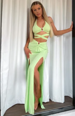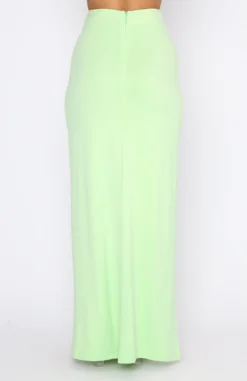 Introducing your new dream two piece the Read My Mind Maxi Skirt in Green. Featuring a maxi length, side slit design, soft stretch lined fabric and front ring detail. Pair with the Feeling Good Crop and heels for your next special event.