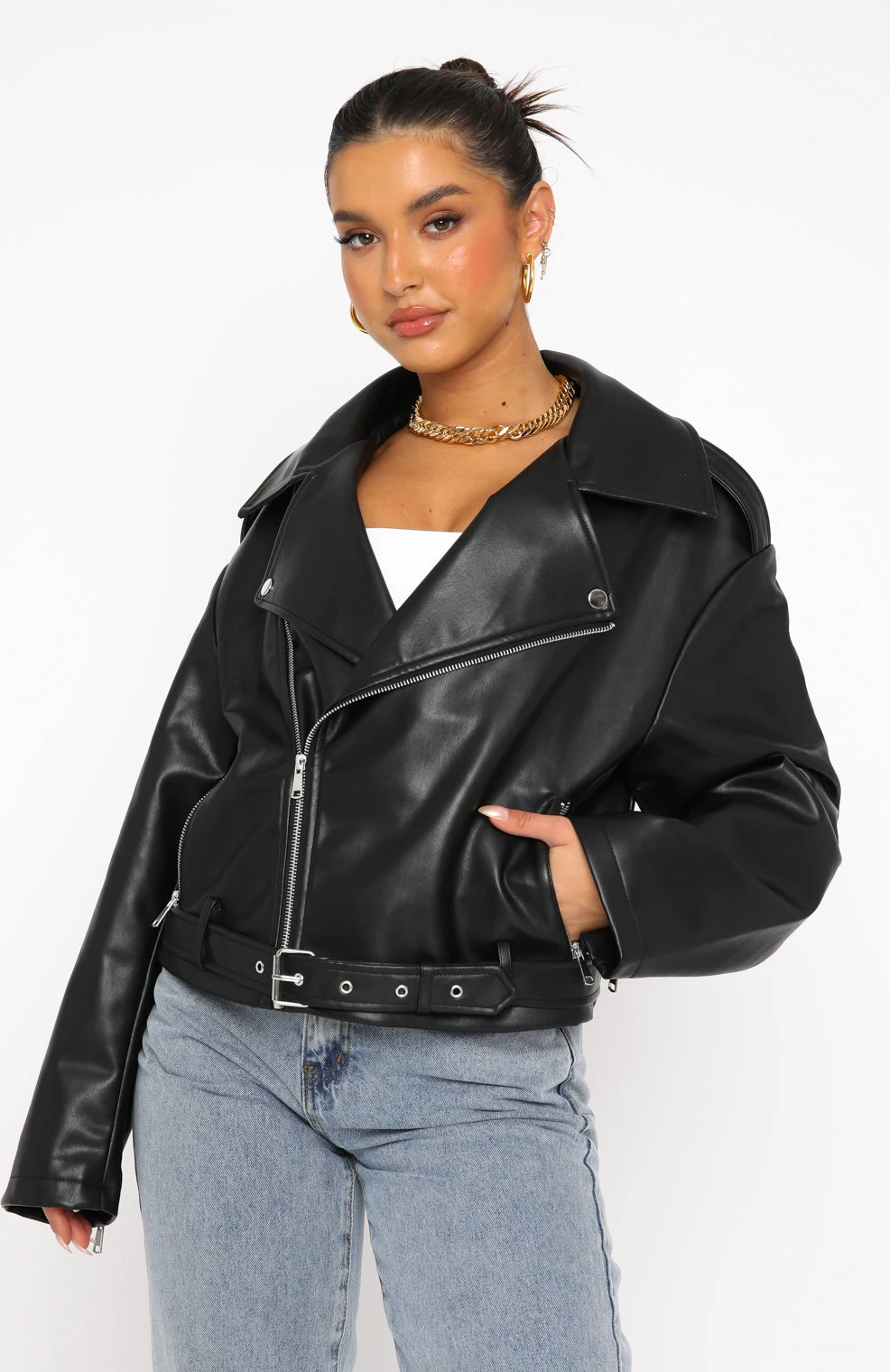 Upgrade your outerwear wardrobe with the Seal The Deal PU Biker Jacket in Black. Featuring long sleeves, front zipper closure, lapel collar, front pockets, removable buckle belt and PU fabric. We love this paired with your favourite pair of White Fox Denim Jeans and gold accessories for the perfect cool girl fit!