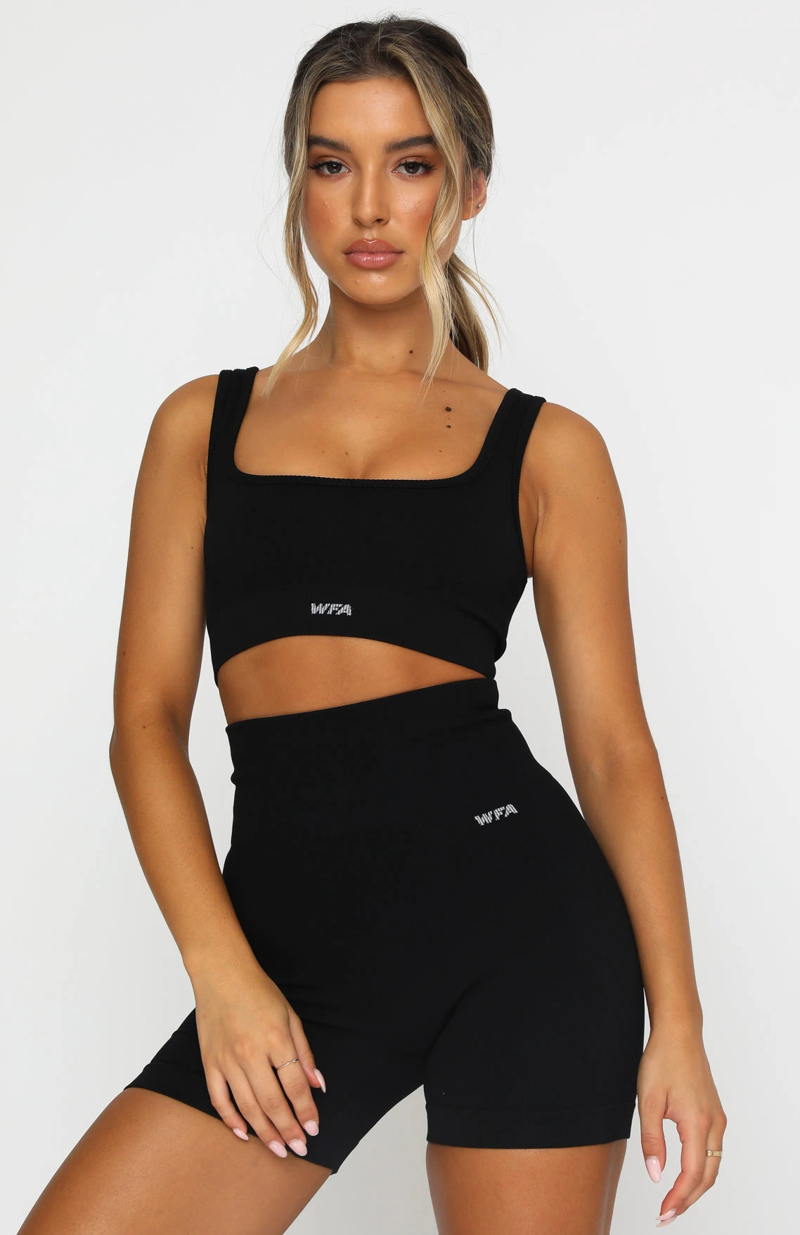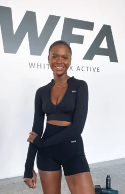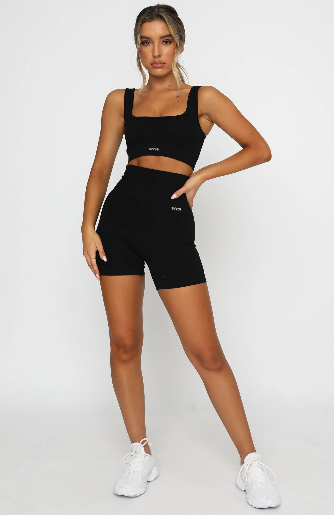 Have a killer workout in our Seamless High Waisted Shorts in Black. These bike shorts have a high wide flattering waistband, smooth flat lock seam detail, thick ribbed fabric and printed WFA logo front side and centre back waistband. Complete the matching set with either our Seamless Ribbed Sports Bra, Seamless Ribbed Long Sleeve Crop or Seamless Ribbed Sports Crop for a stand out gym look.Â