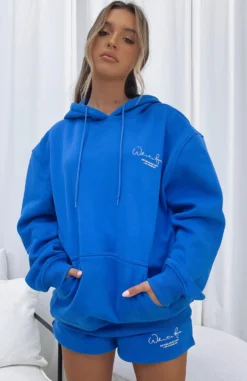 Add some colour to your loungewear wardrobe with our Set The Standard Hoodie in Electric Blue. This jumper is an oversized style with long sleeves, front hand pocket centre front, adjustable drawstring hood, super soft fleece fabric and embroidered and printed logo front side. Complete the matching set with our Check It Out Lounge Shorts or Still That Girl Sweatpants for a statement tracksuit look.