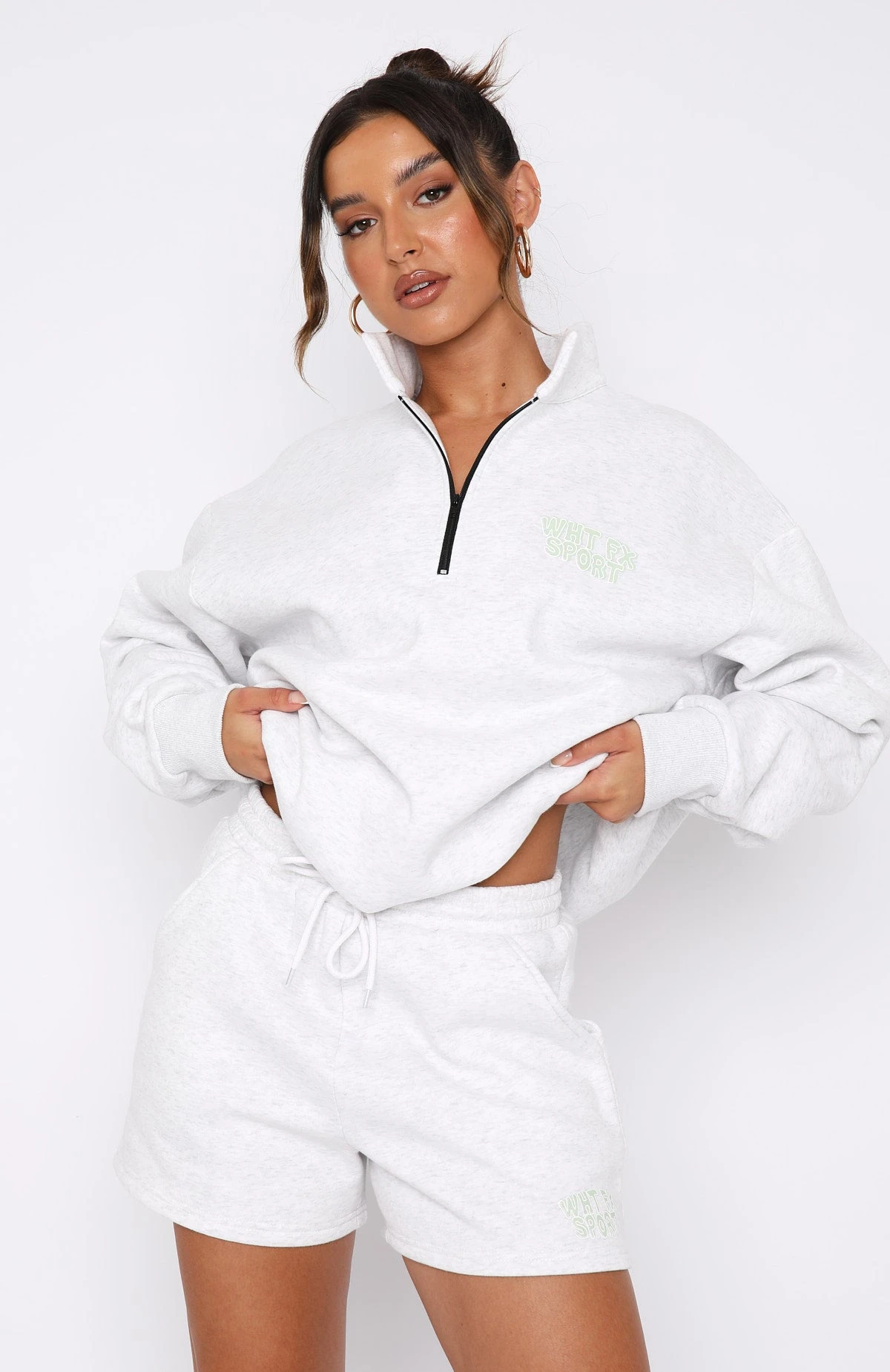 Stay comfy and cosy in the Sport Series Zip Front Sweater in Grey Marle. Featuring an oversized fit, zip front, ribbed hemline and cuffs, fleece lining, print logo front side and centre back. Complete the look with the matching Sport Series Lounge Shorts and sneakers for the perfect off-duty look!
