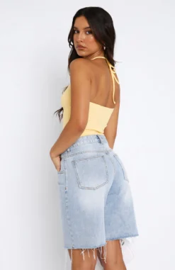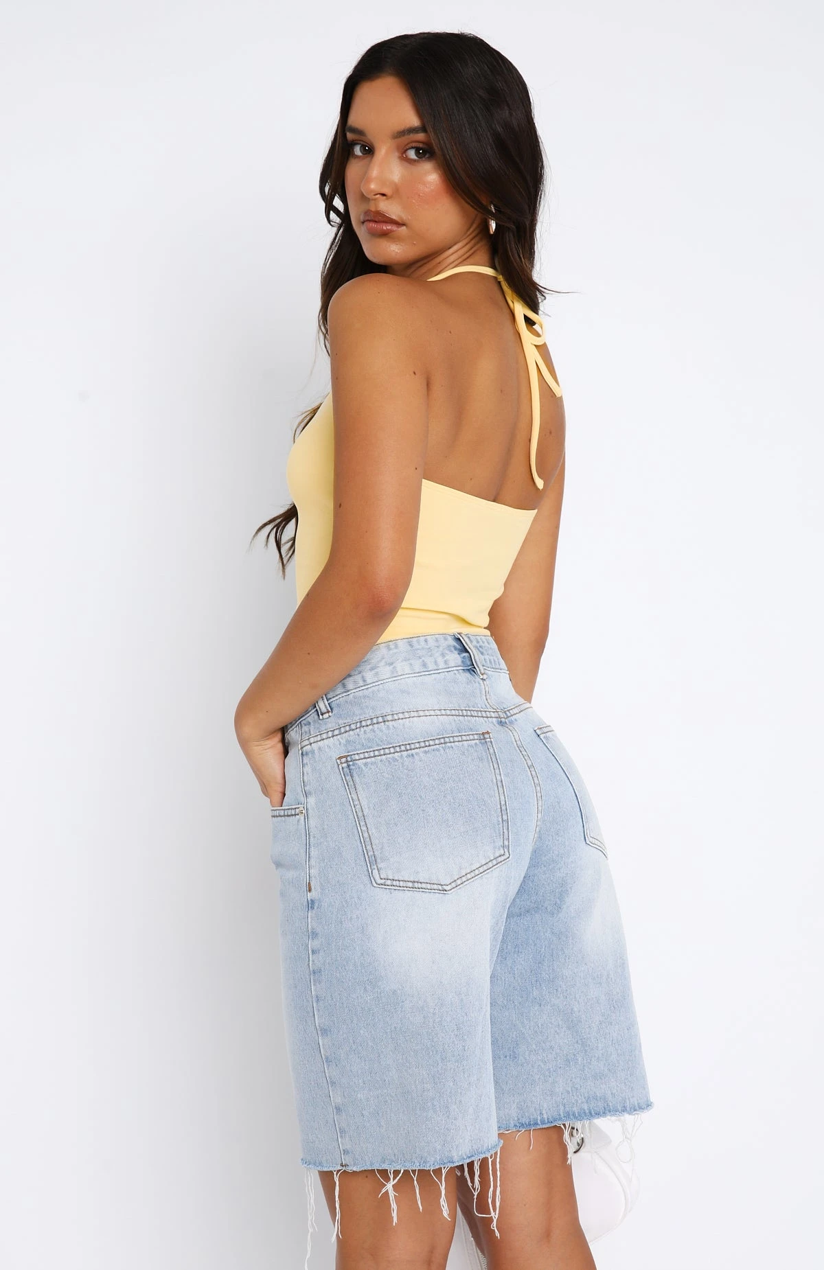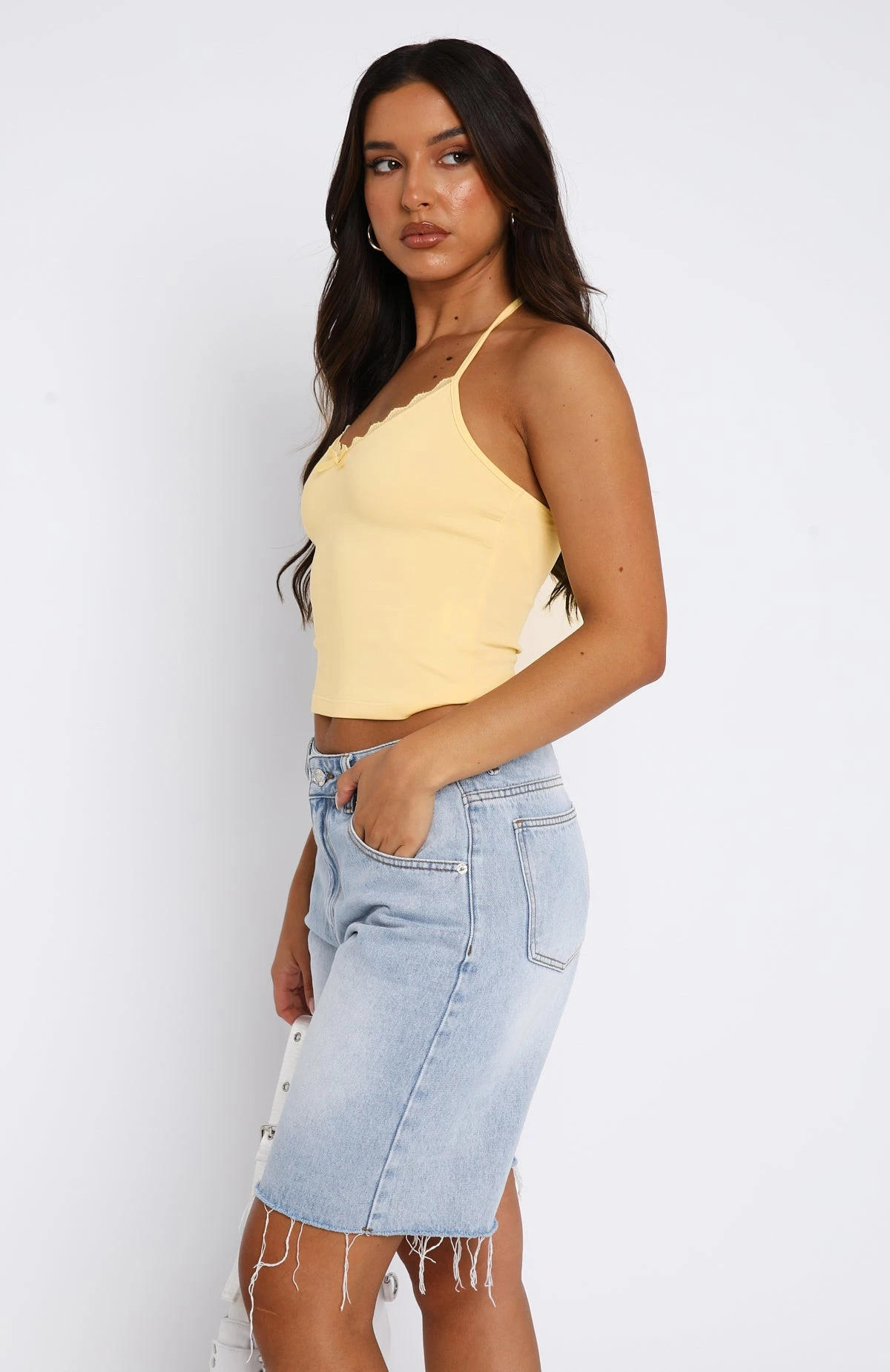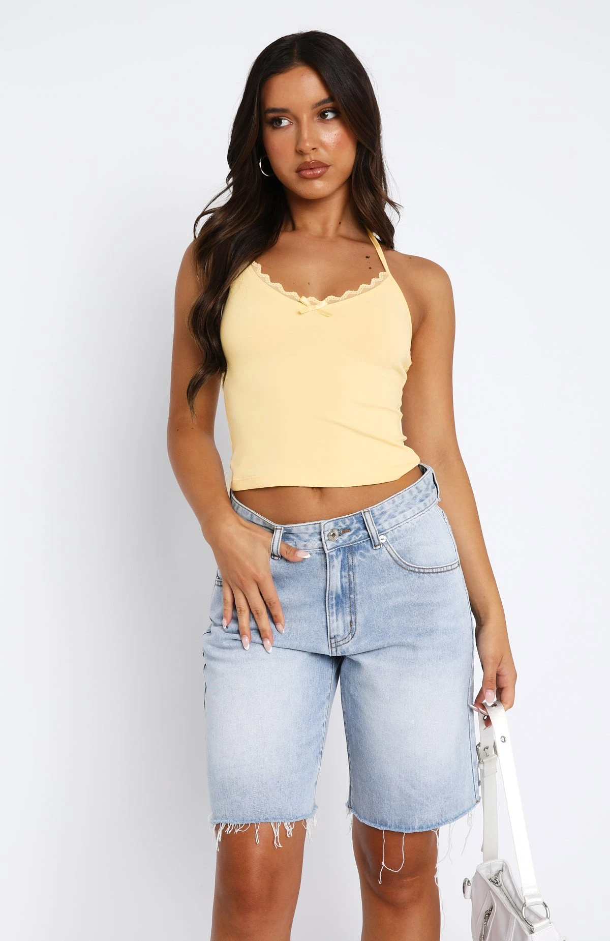 Elevate your basics with the Stay By Your Side Top Butter. Features halter neck style straps with tie-up back design, backless, lace trim hem design, ribbon bow detail at front and self lined, soft, stretch fabric. Pair with long shorts and a mini bag. You’ll be setting the trends with this cute crop.