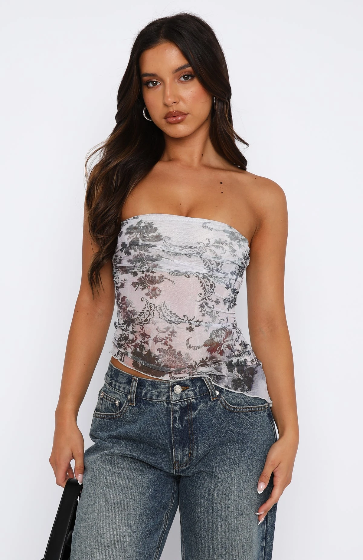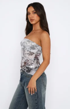 Your next statement top, the Talk It Up Top Dove Paisley is a perfect spring essential. Features a strapless fit, grip tape, ruched and lined bust design, sheer mesh fabric, asymmetric hemline, lettuce trim and gorgeous printed fabric. Pair with a mid rise jean and mini bag! We’re in love. Â