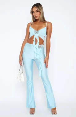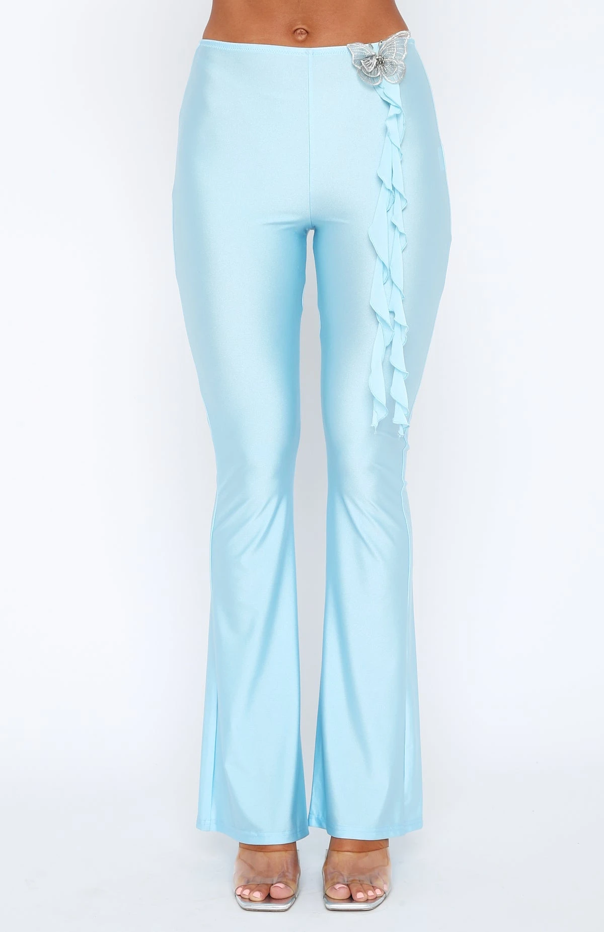 The Touch The Sky Pants in Baby Blue is giving the life of the party vibes! These pants are high-waisted and features grip tape, butterfly applique with stretch, flare legs and shimmer fabric. We love this paired with the matching Headlines Crop and platform slides for a show-stopping look!