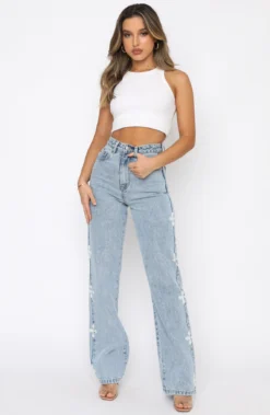 Every White Fox babe needs these statement jeans. The Unbothered Jeans in Washed Blue Print are high waisted with zipper & button closure at front, belt loops, distressed rip detailing, 5 pocket design, straight leg fit, non stretch denim and print detail. We love this paired with a cute crop top and sneakers for the ultimate hot girl look.