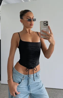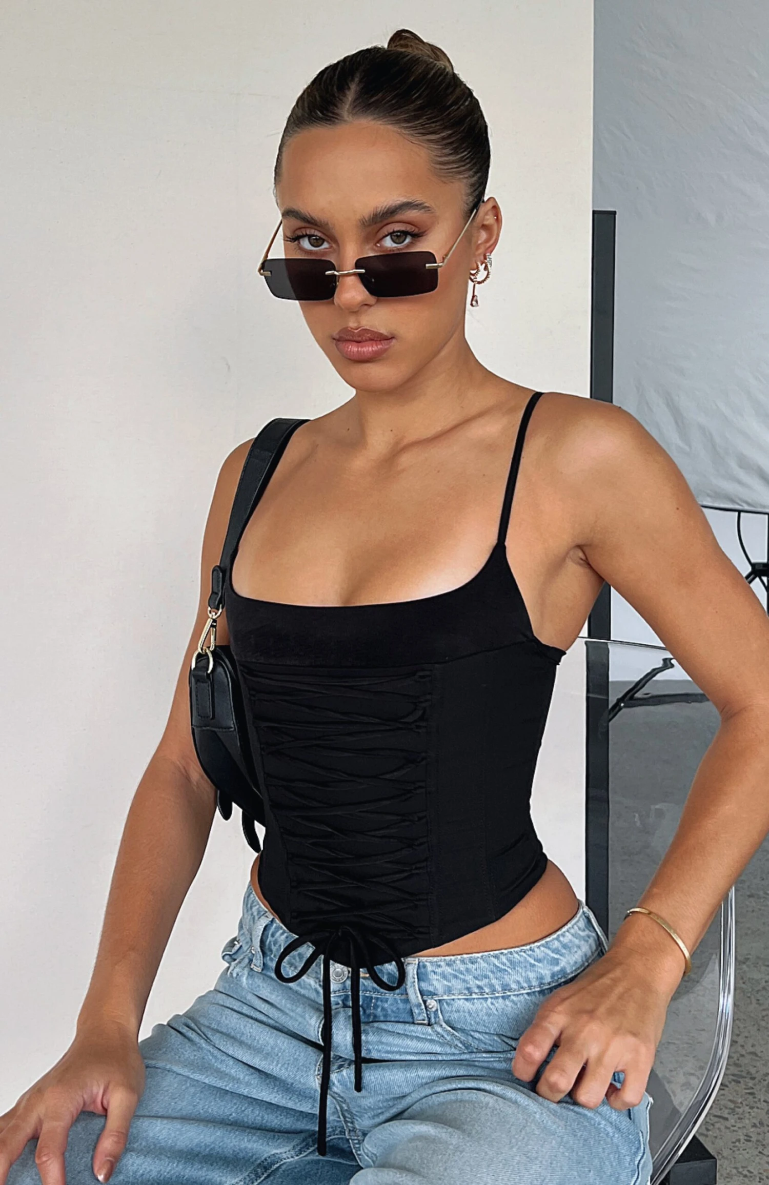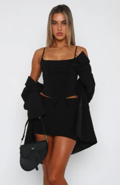 Earn style points with the Until You’re Mine Bustier in Black. Featuring thin, adjustable straps, straight neckline, lace-up front design, zipper centre back, boning in bodice and lined fabric. Complete the look with a cute mini skirt and gold accessories for a stunning look!
