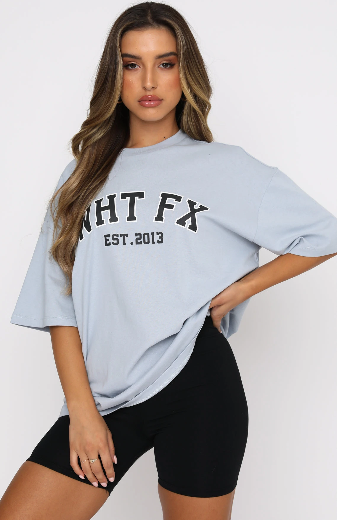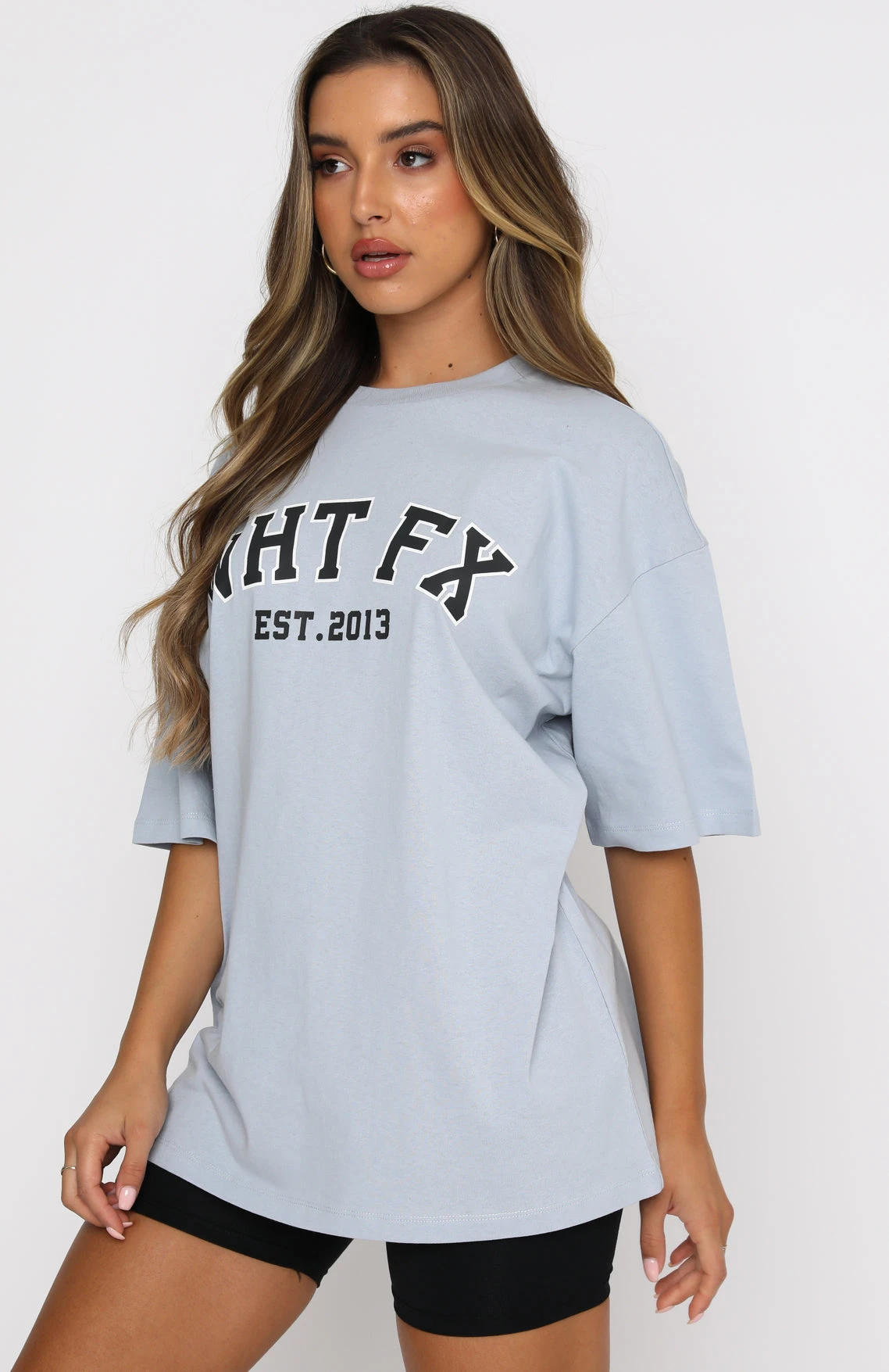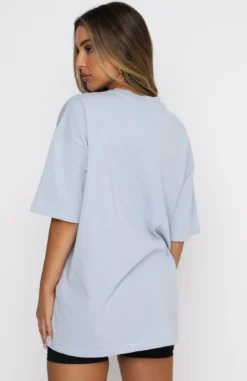 Style meets comfort in our Varsity Tee in Dusty Blue. This oversized top has a high scooped neckline, slouch shoulders, and printed graphic centre front. Complete the look with bike shorts and sneakers for a seriously stylish outfit.