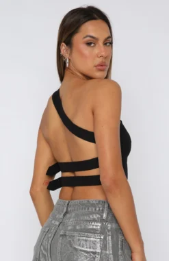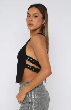 Slay the night in new, Walk To Remember Top Black. Features a one-shoulder fit, backless design with adjustable metal buckle straps, cropped length and lined fabric. Pair with a simple bottom and let the top do all the talking! We’re in love.