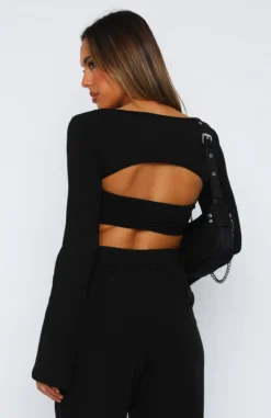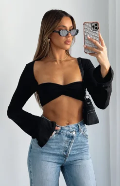 Feel stunning in our The What About Me Long Sleeve Crop in Black. This bandeau crop features long sleeves, low neckline, mesh lining and lightweight, stretch fabric. To complete the look pair with a mini skirt and gold accessories for a dreamy look!