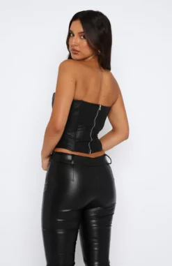 Take your night out look to a whole new level! The Whole Vibe Bustier Black features grip tape, boning in bodice, front eyelet closure design, straight neckline, sequin embellished front design, centre back zipper with hook & eye, lined fabric and PU fabric. Pair with matching PU pants and heels for a dance ready fit!