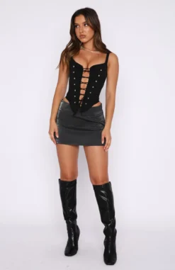 Show up and show off with the Wicked Games Mini Skirt in Charcoal. This mini skirt is high-waisted and features side leg splits, zipper centre back and PU fabric. We love this paired with a bustier and knee-high boots for a stunning look!