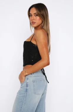 Perfect for a date night or last minute drinks, Your Legacy Bustier Black will be a fun and flirty choice! Featuring a back lace-up design, thin adjustable straps, boning in bodice, sequin detailing and mesh lining. Pair with a low rise jean and mini bag to complete the look. So chic!